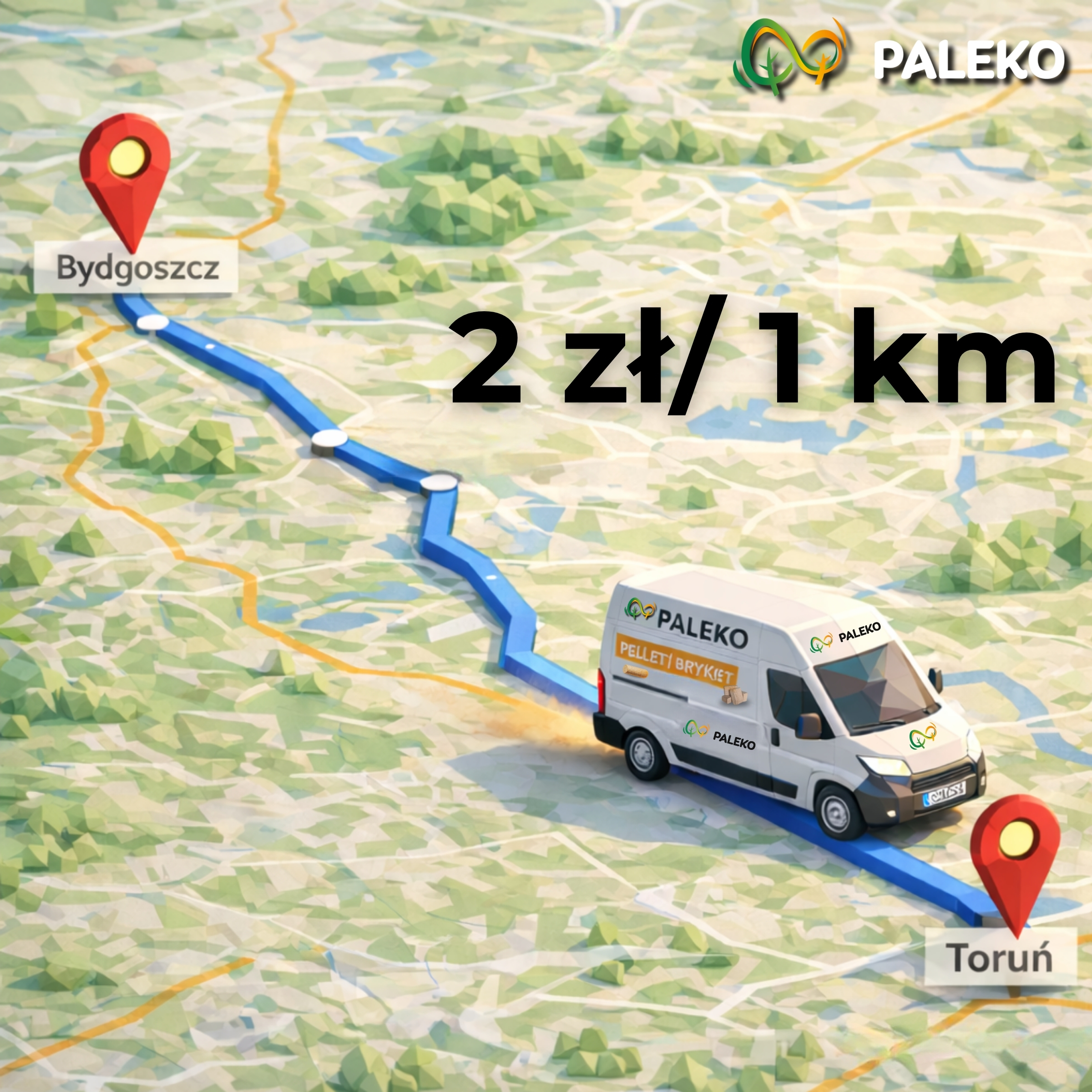Opłata za dowóz wynosi 2 zł za każdy kilometr, liczony tylko w jedną stronę, niezależnie od zamawianej ilości (od 0,5 do 2 ton). Przykład: dla trasy Bydgoszcz – Toruń (50 km) koszt transportu wynosi 100 zł. W przypadku dostaw realizowanych samochodem z windą warunki transportu ustalamy indywidualnie.