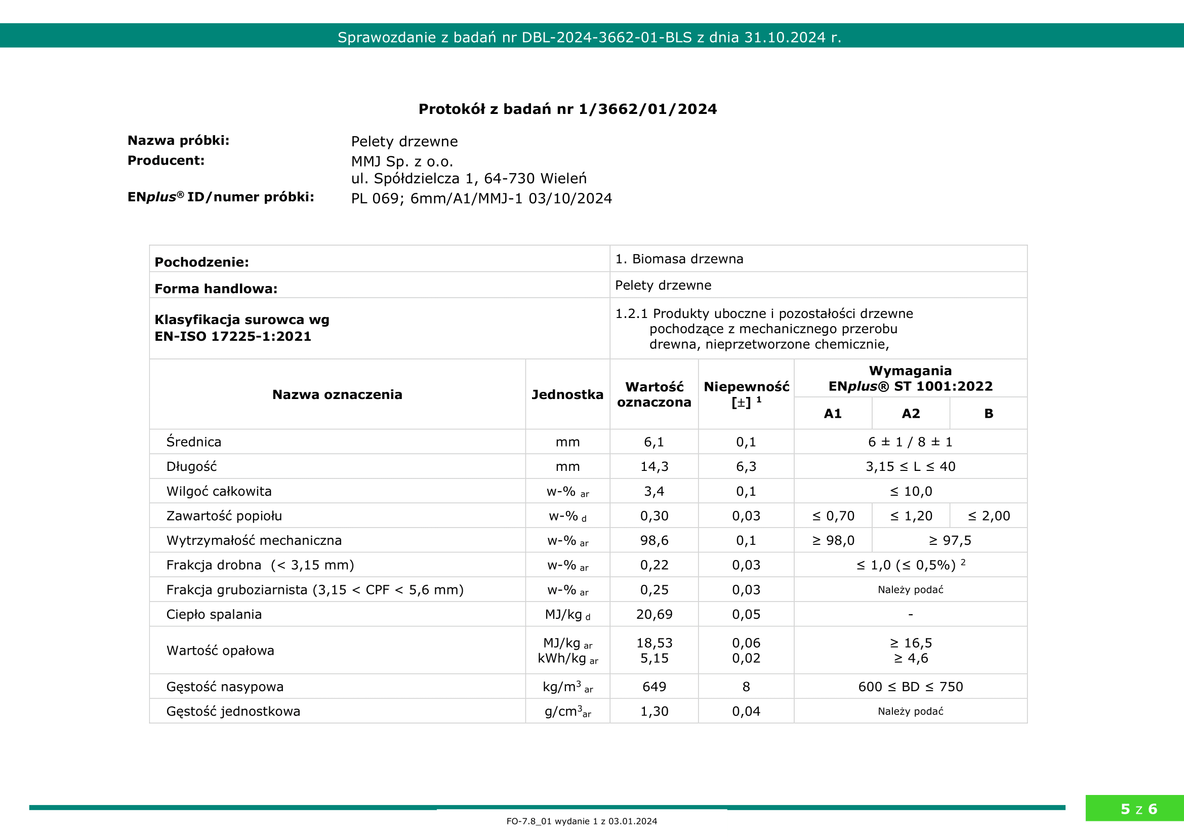 - wytrzymałość mechaniczna – 98,6% (twardość, min.98% w ENplus A1)