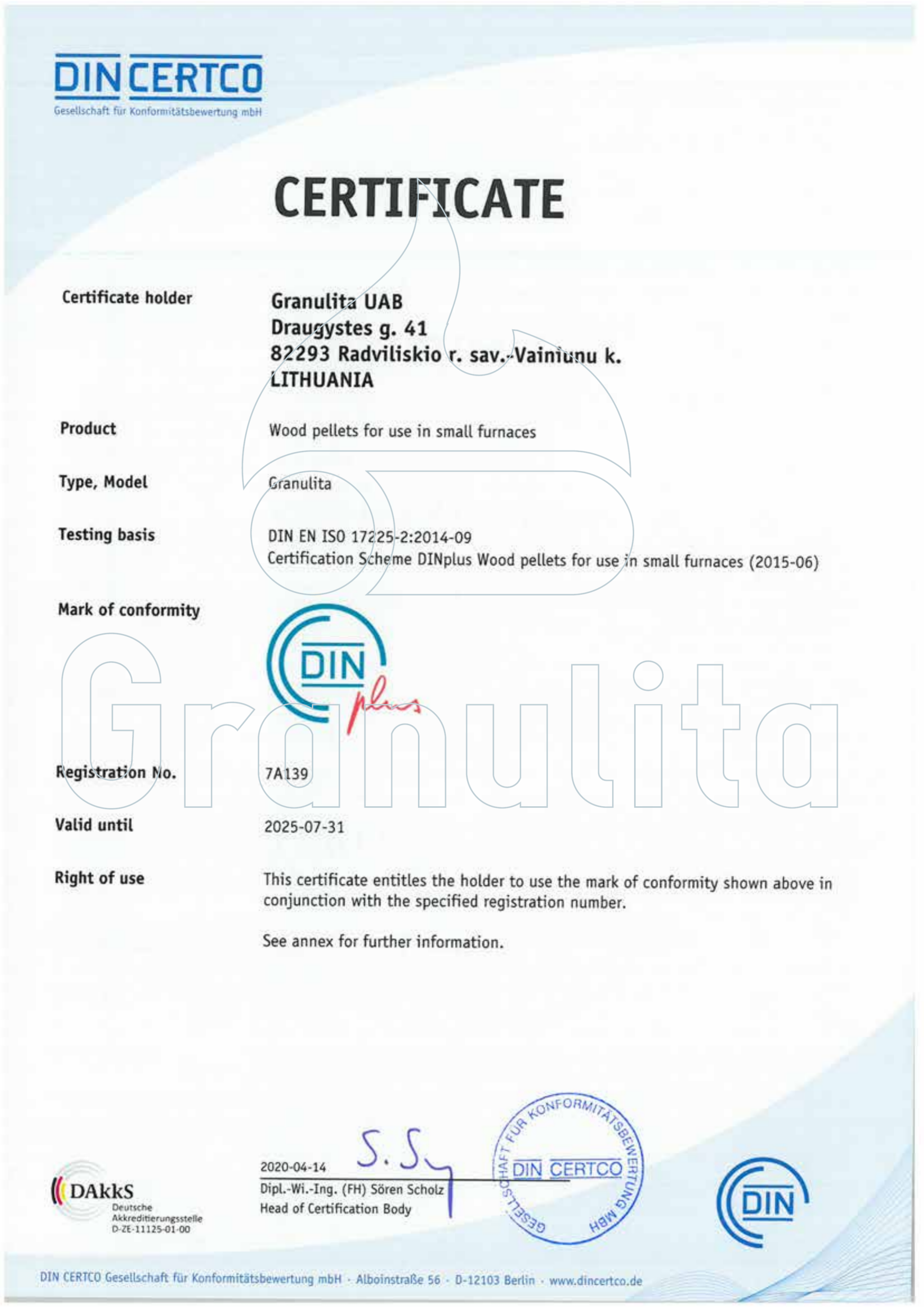 Pellet z Litwy Granulita posiada prestiżowe oznaczenia jakości, takie jak ENplus A1, DINplus oraz FSC, które potwierdzają zgodność z rygorystycznymi normami europejskimi dotyczącymi czystości surowca, parametrów spalania oraz odpowiedzialnego pochodzenia drewna. Certyfikaty te są gwarancją, że pellet drzewny Granulita spełnia najwyższe standardy zarówno w zakresie efektywności energetycznej, jak i bezpieczeństwa użytkowania w nowoczesnych systemach grzewczych.