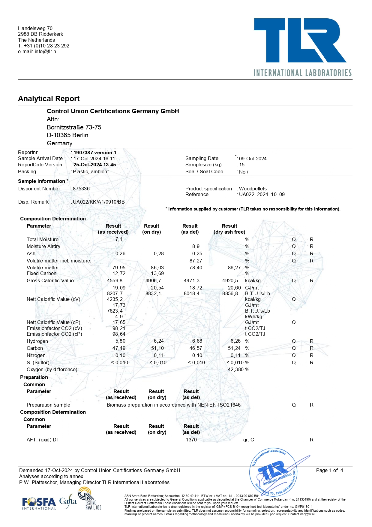 • popiół – 0,26 % (najczystszy pellet 0,3-0,5%, norma ENplus A1 do 0,7%)